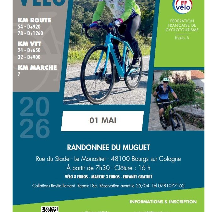 Comme chaque année, le CCM en collaboration avec le comité des fêtes du Monastier, vous propose une randonnée Vélo/marche le vendredi 1er mai 2026.